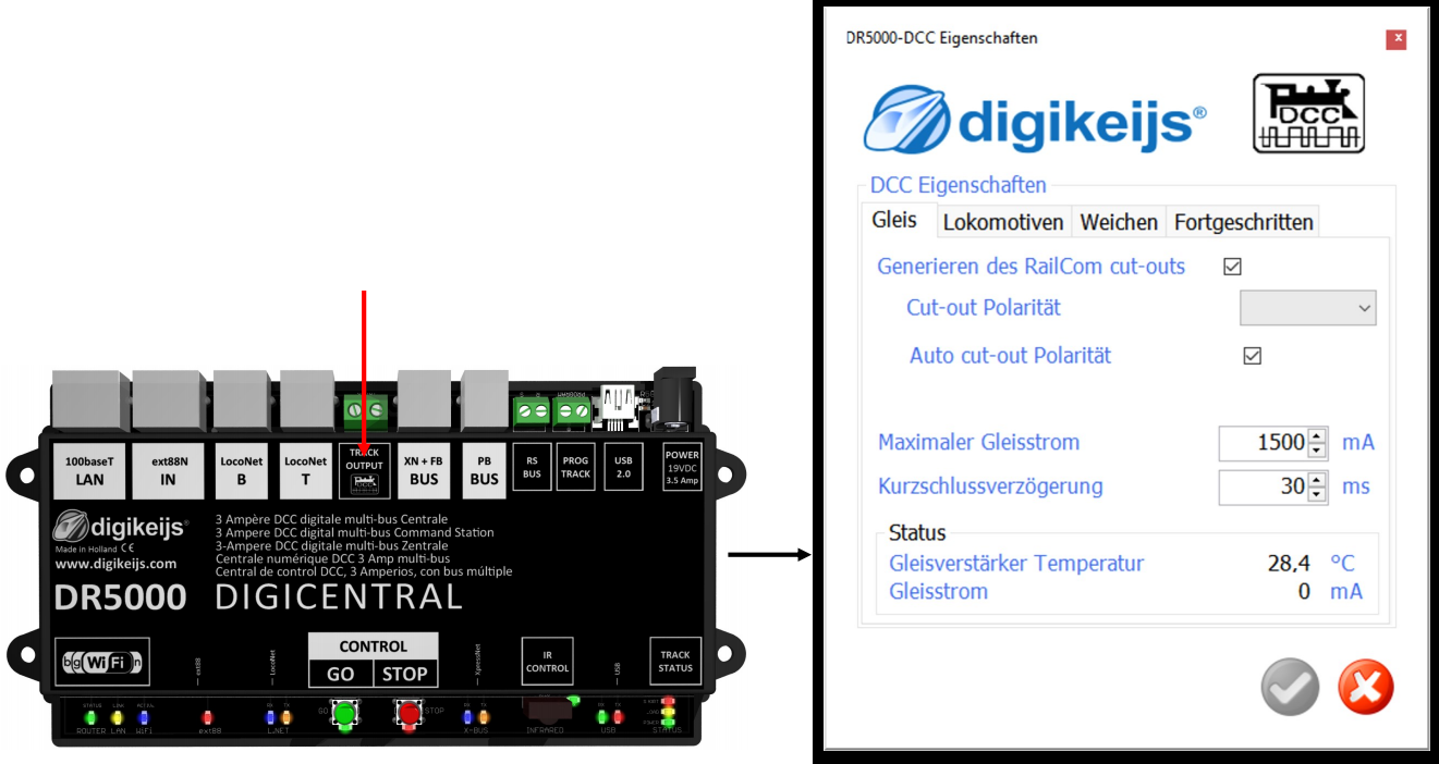 Der maximale Ausgangsstrom der DR5000 beträgt 3 A. Wenn Sie mehr Leistung benötigen, verwenden Sie einen Booster mit einer H-Brücke am Ausgang, wie z. B. die DR5033. Ältere Booster mit gemeinsamen Masseanschluss (z. B. Märklin®) sind nicht geeignet und führen zu Kurzschlüssen oder zu bleibenden Schäden an der DR5000!