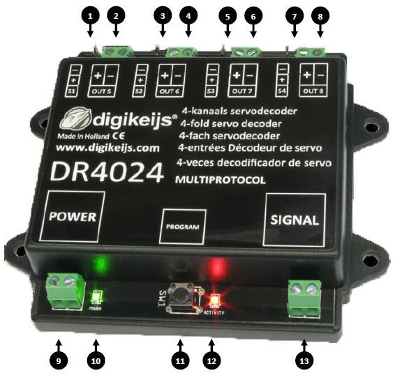 Das DR4024 ist ein voll programmierbarer Multiprotokoll-Servodecoder. Jeder Ausgang verfügt auch über einen zusätzlichen Schaltausgang um z.B. auf ein Licht oder ein Entkupplungsgleis umzuschalten.