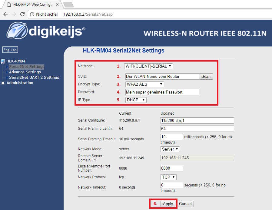 Nach der erfolgreichen Anmeldung am Router der Zentrale kann die DR5000 nun als WLAN-Client (WiFi-Client) konfiguriert werden. Dafür bitte auf den Menüpunkt „Serial2Net Settings“ klicken. In den folgenden Fenster bitte die gekennzeichneten Einstellungen entsprechend der Konfiguration des heimischen Routers anpassen.